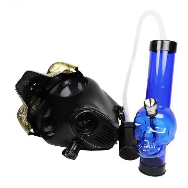 Introducing the Metallic Skull Gas Mask Bong. When worn, the mask creates an airtight seal around your face, so as you inhale the mask fills up with smoke for the ultimate hit. The bong simply pushes into the mask.