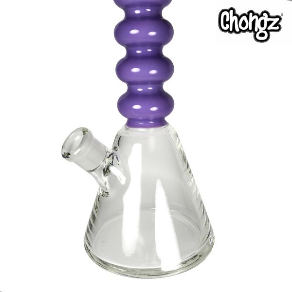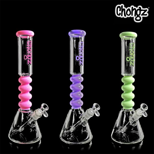 This stunning bong by Chongz measures a huge 40cm in height. It is made from quality clear glass and features milky coloured accents. The beaker style shape provides a sturdy base that holds plenty of water.