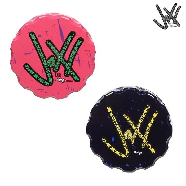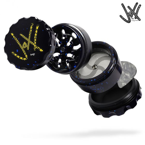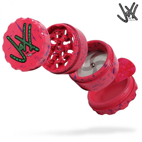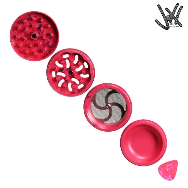 This grinder is currently available in two colours - Navy Blue or Pink. Both colours feature a contrasting speckled paint design with a trippy Jaxx leaf logo on the top.