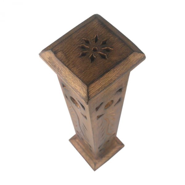 The tower itself has been hand carved from wood. The holes in the tower allow the incense to escape and permeate your home, while the tower itself has been engraved with a beautiful leaf pattern for aesthetic beauty.