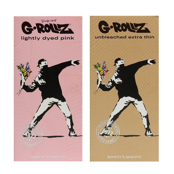 This new set of Banksy themed papers from G-Rollz shows the iconic silhouette of the flower thrower, also known as Love is in the Air. Originally painted in Bethlehem, on the wall separating Palestine and Israel, it showing a masked Palestinian throwing a bouquet of flowers. His inspiration came from 1960s riots, with it representing a closer tragedy of an ambushed 2005 pride parade, leaving several injured and killed. While the flowers have been known to represent a symbol of pride, they're more commonly seen as a sign of peace, in times of civil unrest.